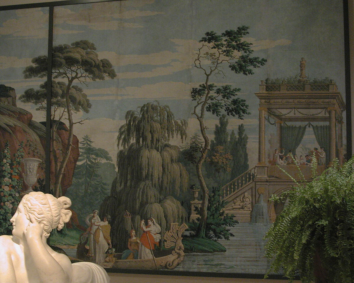 This woodblock-printed wallpaper depicts the Promenade in a Barge, from the panoramic wallpaper series, Les Voyages d'Anthénor.