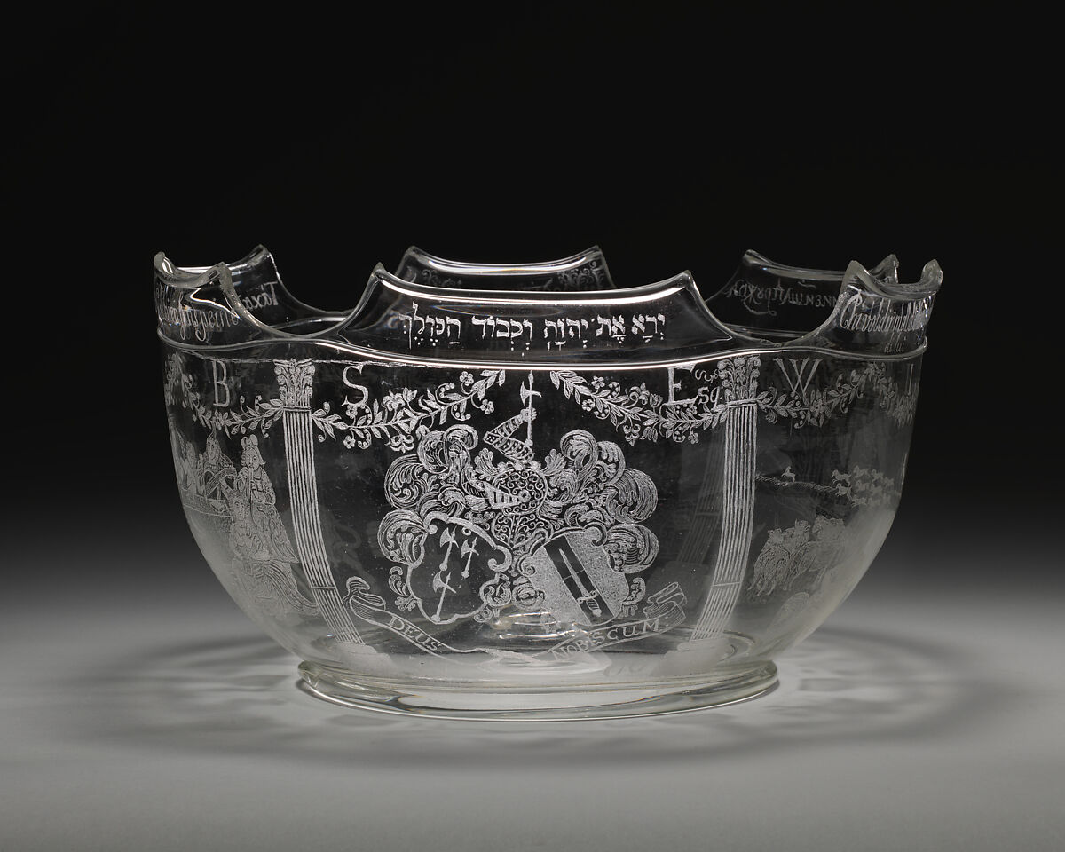 Monteiths, filled with ice water, were used to cool wineglasses, which were suspended in the water by the foot held in the notches of the rim. At the time this piece was made, monteiths were primarily of silver; thus this rare example is an unusually large object to be found in glass. The piece was engraved (with a diamond point) with the arms commemorating the marriage of William Gibbs of Horsley Park, Essex, and the heiress Mary Nelthorpe and inscribed with the name of the groom. Around the rim are moralizing inscriptions in Italian, Hebrew, Slavonic, Dutch, French, and Greek (such as "Fear God and honor the King" in the main panel). Cupid sitting between the bride and groom sings from a songbook while musicians assembled around a table play the lute, viol da gamba, and recorder. Other panels are engraved with scenes of country pursuits, such as harvesting and fishing. This monteith is the Museum's earliest example of flint glass, which was perfected in the late seventeenth century in England, where it immediately became the preferred material, having equal strength but greater inner "fire," or luminosity, than the Venetian and German imports.