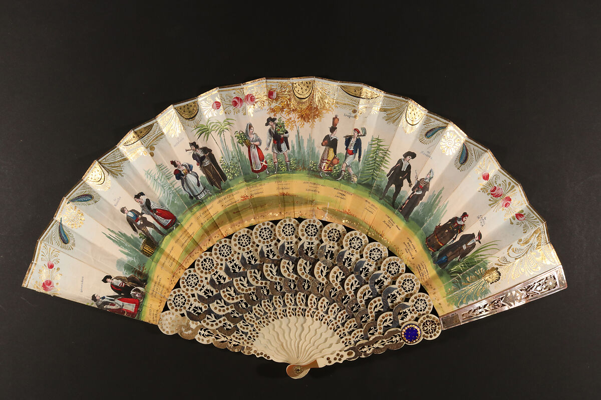 The figures decorating this fan were copied from an 1801 publication titled “General Collection of the Costumes Currently Worn in Spain,” a book that contributed to establishing a national iconography of folk costume. Although the published plates by Antonio Rodríguez present individuals, the fan designer has arranged them into couples representing different regions of Spain. The fan participates in a tradition of costumbrismo, a pictorial and literary genre focused on regional particularities that developed in the Hispanic world in the nineteenth century. The distinctive sticks of this fan, richly decorated with spangles and intertwining metallic serpents, as well as the touches of gold on the leaf, would give it a reflective quality when in use.