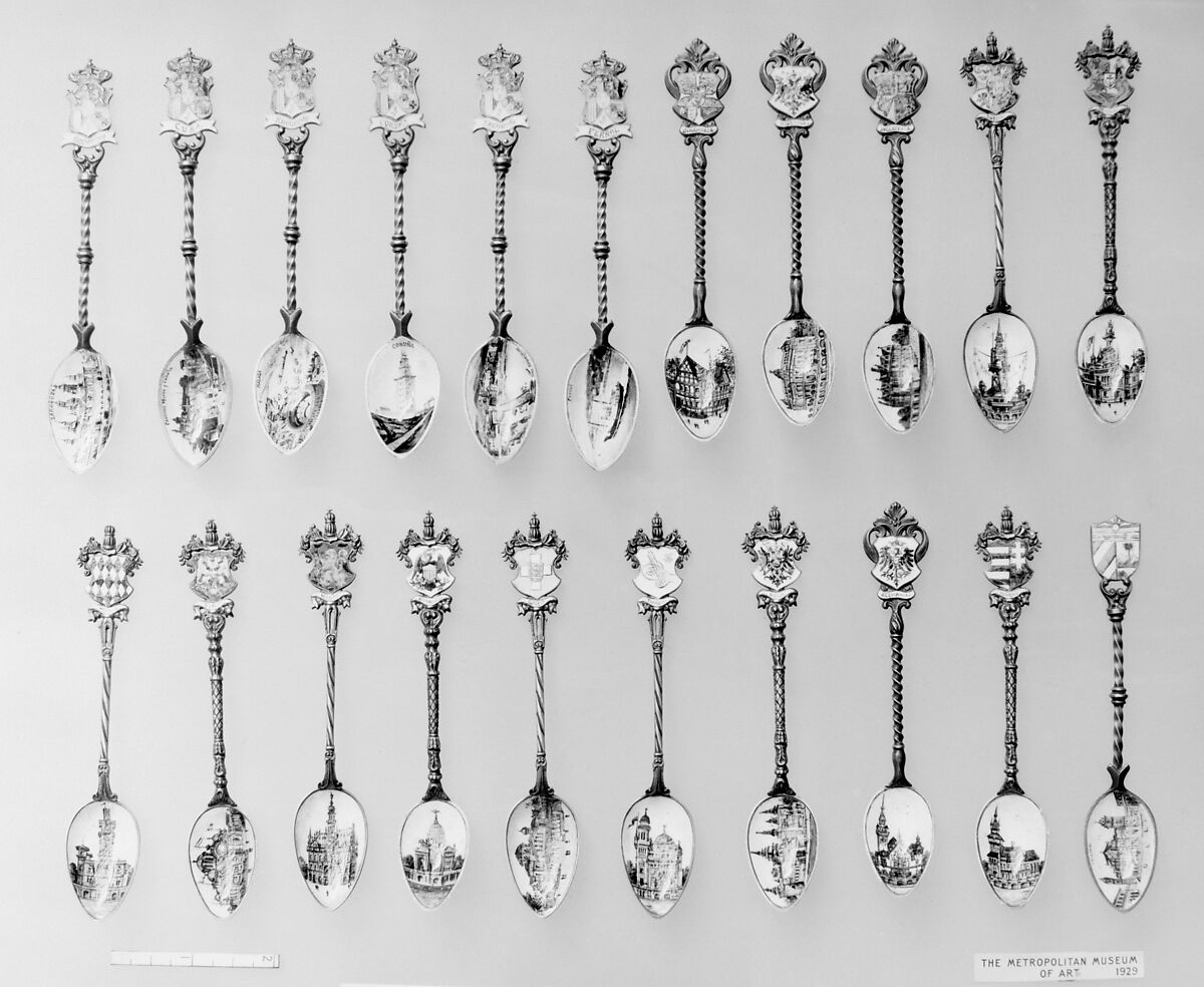 - Title: Souvenir spoon with view of large building beside a wharf and arms of Sweden
