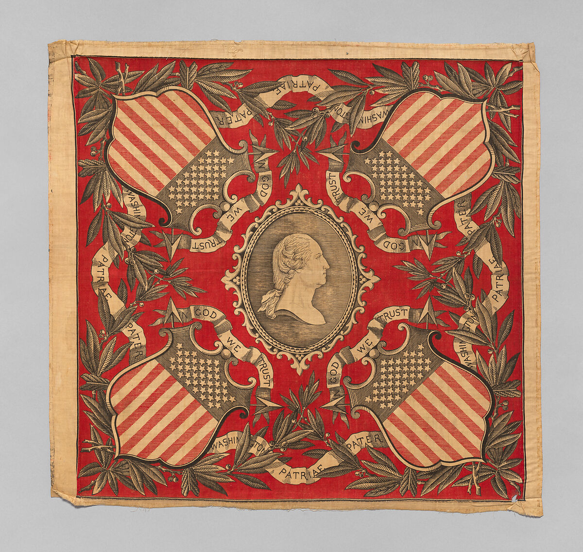 The design on this handkerchief is based on a medal with bust of Washington on obverse by Simon Benjamin Duvivier (1730–1819). Examples of this medal in the Museum's collection are 83.2.10–.12, 83.2.20, 07.251.105, and 07.251.34.