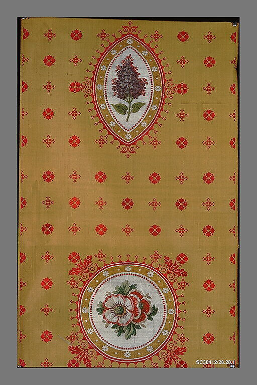 Designed by Jean-Pierre Séguin for the fourth petit salon of the apartment of Napoleon I at Versailles, this fabric was not used until the period of the Restoration by the duchesse d'Angoulême at Saint-Cloud. A gros de Tours (heavy silk), its design is based upon a wall fabric at Malmaison. Its bright yellow ground is punctuated by cerise rosettes and bunches of brocaded lilacs and anemones within central medallions. The lilac and anemone patterns covered chair backs and seats respectively.