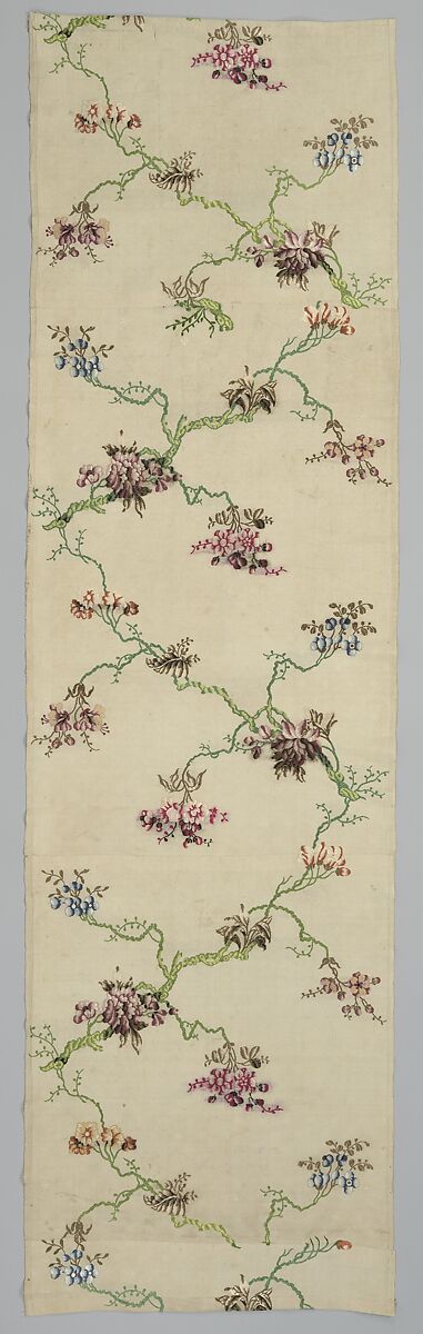 This design is typical of English dress silks of the period: the spare sprays of flowers are set on a white background, and the branch supporting the flowers meanders back and forth across the width of the fabric. The appearance of the truncated branch from which various types of flowers bloom may be a nod to the chinoiserie trend in the eighteenth-century Rococo style.