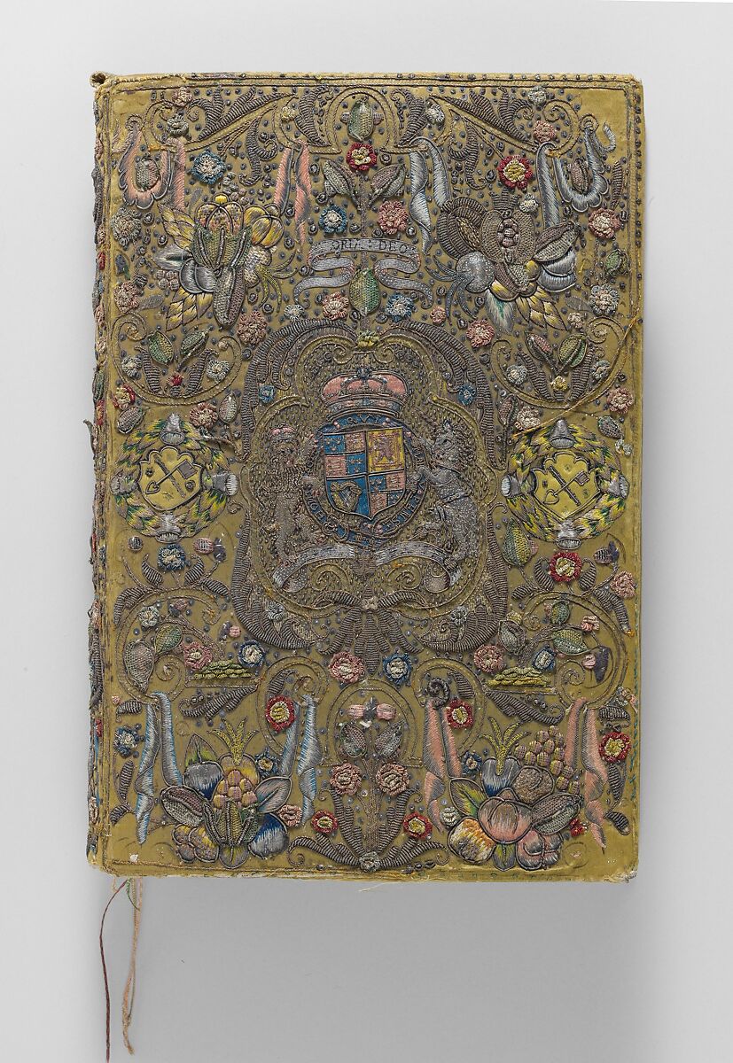This elaborate quarto-size bookbinding is the work of a professional embroiderer and contains a rich variety of materials applied with a series of complex and imaginative techniques. The composition of the cover and matching back is dominated by a central royal blazon of the Stuart monarchy quartered with the arms of England, Scotland, and Ireland. The arms are surmounted by the royal crown and supported by a lion and unicorn engaging the shield with the Order of the Garter with its motto: "Honi Soit Qvi Mal Y Pense" in silver filé. The royal arms are surrounded by a voluted cartouche accentuated by fronds of tightly packed silver purl, couched down closely onto the green satin ground and headed by a scroll with the inscription "Gloria Deo." Flanking this central cartouche are two unidentified badges bearing a crossed silver key and what appears to be a staff, each within a wreath of satin-stitch laurel leaves and silver bells. Beneath and above these is a finely worked voluted interlace of couched silver cording, from which all the foliage, flowers, and heavily fruit-laden festoons hang in thick profusion.