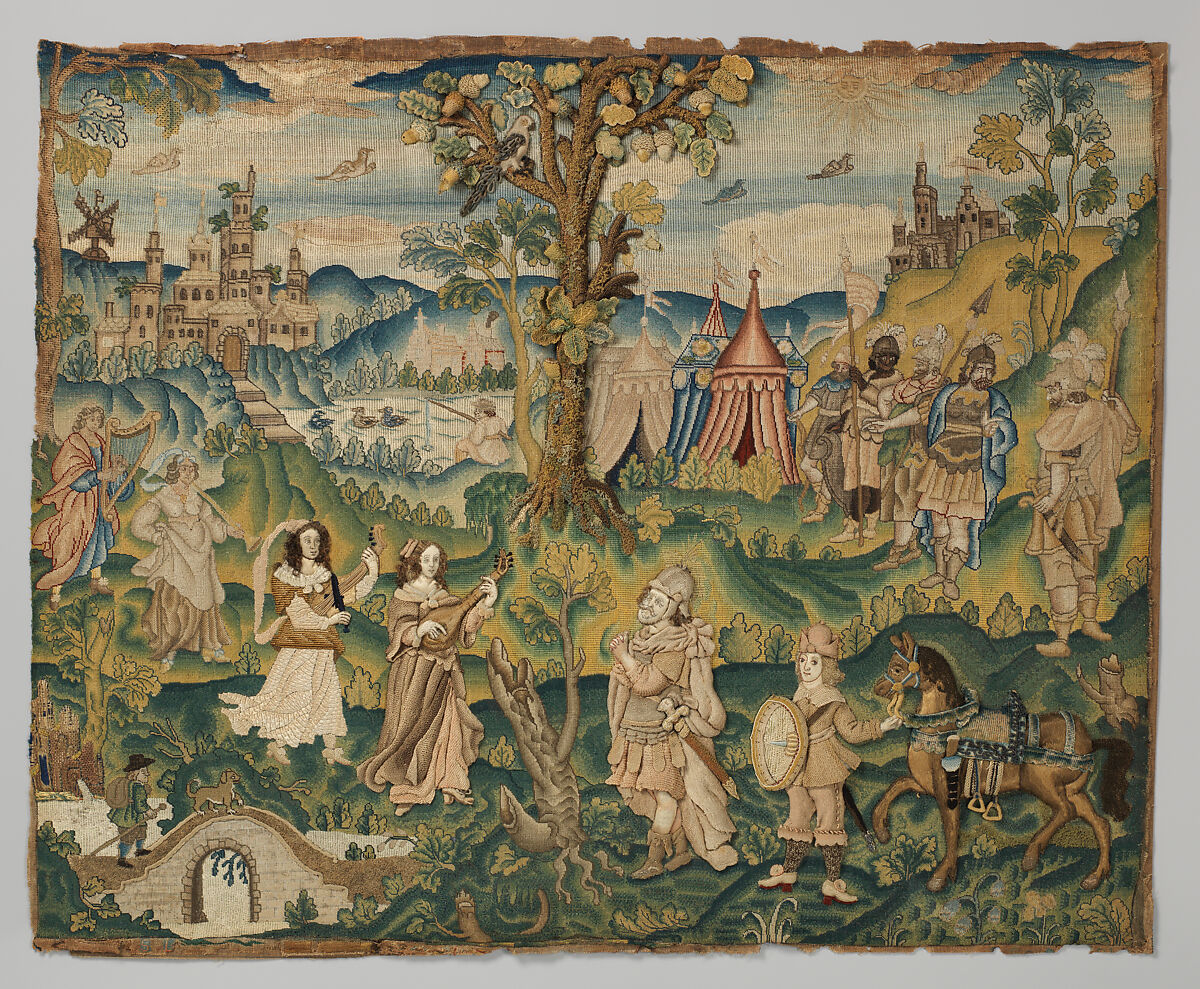 This Old Testament scene was probably drawn by a local artist for the young lady of rank who worked it with unusual skill and delicacy. As was frequent, he composed the picture from a variety of sources. The graceful figures of the daughter and her attendant are seen in other embroidered pictures of the period and must have come originally from an engraving, such as the scenes from the life of David by Martin de Vos and Johann Sadler, which provided the group of Roman warriors used here to represent the elders of Gilead.