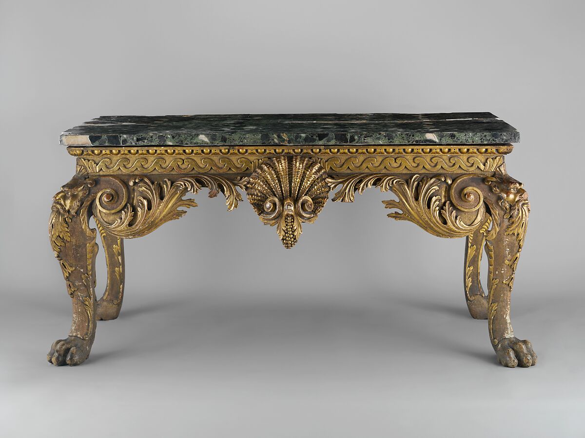 This monumental pair of side tables (see also 2007.196.2a-c) was likely made after an unfinished drawing, now at the Victoria and Albert Museum, London, by the designer and carver Matthias Lock (ca. 1710–1765). Although Lock is best known for his designs in an English version of the French Rococo style, this drawing is associated with the Palladian movement. Propagated in early eighteenth-century England by the architect and designer William Kent and his patron Lord Burlington, the large shell motifs, classical masks, lion's paws, curling acanthus leaves, and running Vitruvian scrolls on these tables are characteristic of Palladian furniture design. The varied surface treatment of the water gilding on portions of these tables, for instance, in the chiseled features of the satyrs, are particularly beautiful. Acquired for the Museum's dining room from Kirtlington Park, near Oxford, these tables were originally part of a larger set; a nearly identical pair is in the collection of the Detroit Institute of Arts.