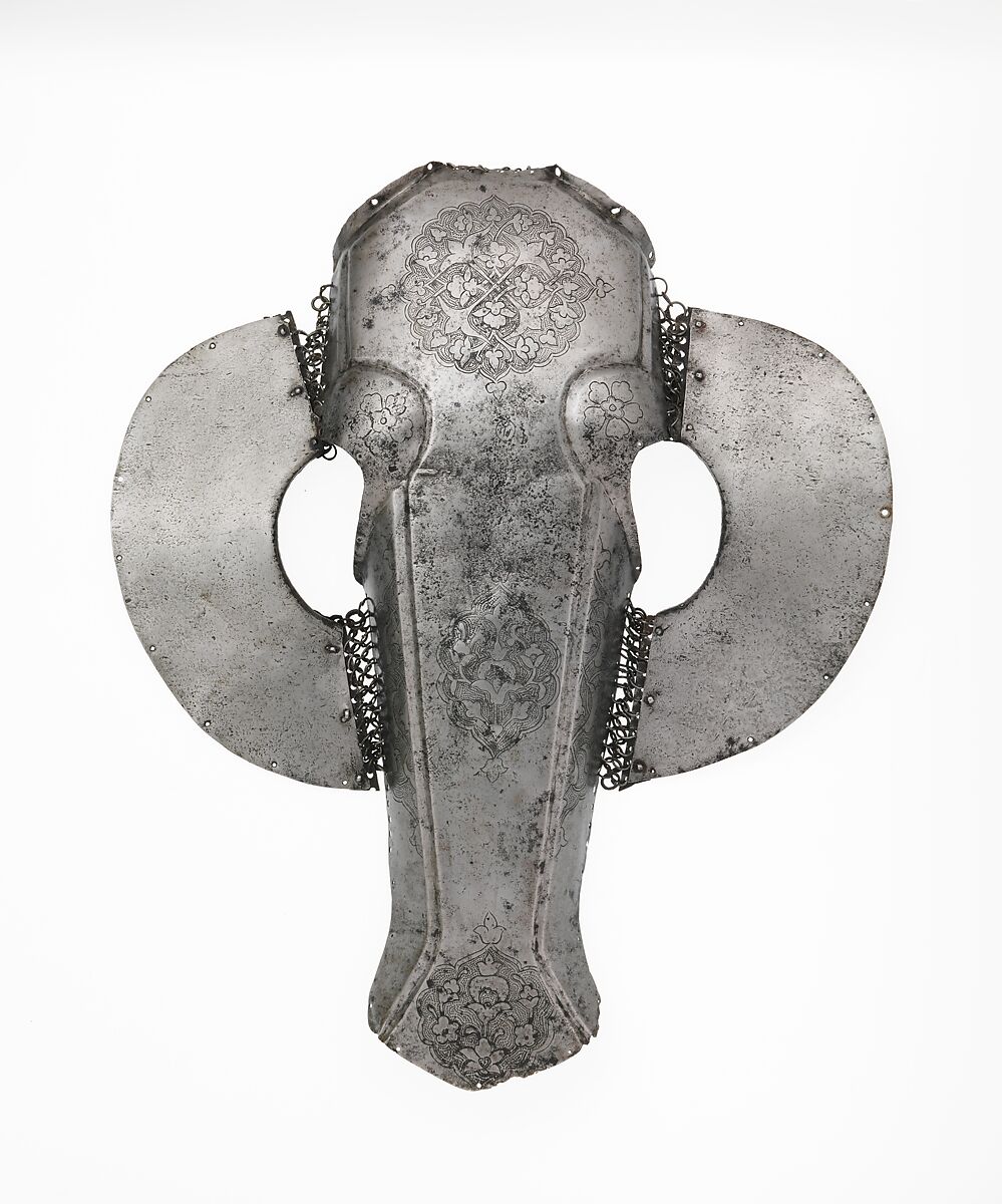 Among the associated pieces, the extremely tall conical helmet (acc. no. 04.3.208) is noteworthy as an example of a type worn in Iran and Russia in the late fifteenth and early sixteenth centuries. Similar helmets depicted in miniature paintings often show a small pennon attached to the long finial. The shield (acc. no. 36.25.610), engraved with large cartouches enclosing floral arabesques, may have originated in fifteenth-century Iran. The ax (acc. no. 36.25.1829), with its long, faceted steel shaft and distinctively shaped blade, is typical of those carried by the Mamluks of Egypt and Syria in the late fifteenth to early sixteenth century. The shaffron (defense for the horses's head) is engraved with arabesques of a type suggesting an Ottoman Turkish origin between about 1525 and 1550.