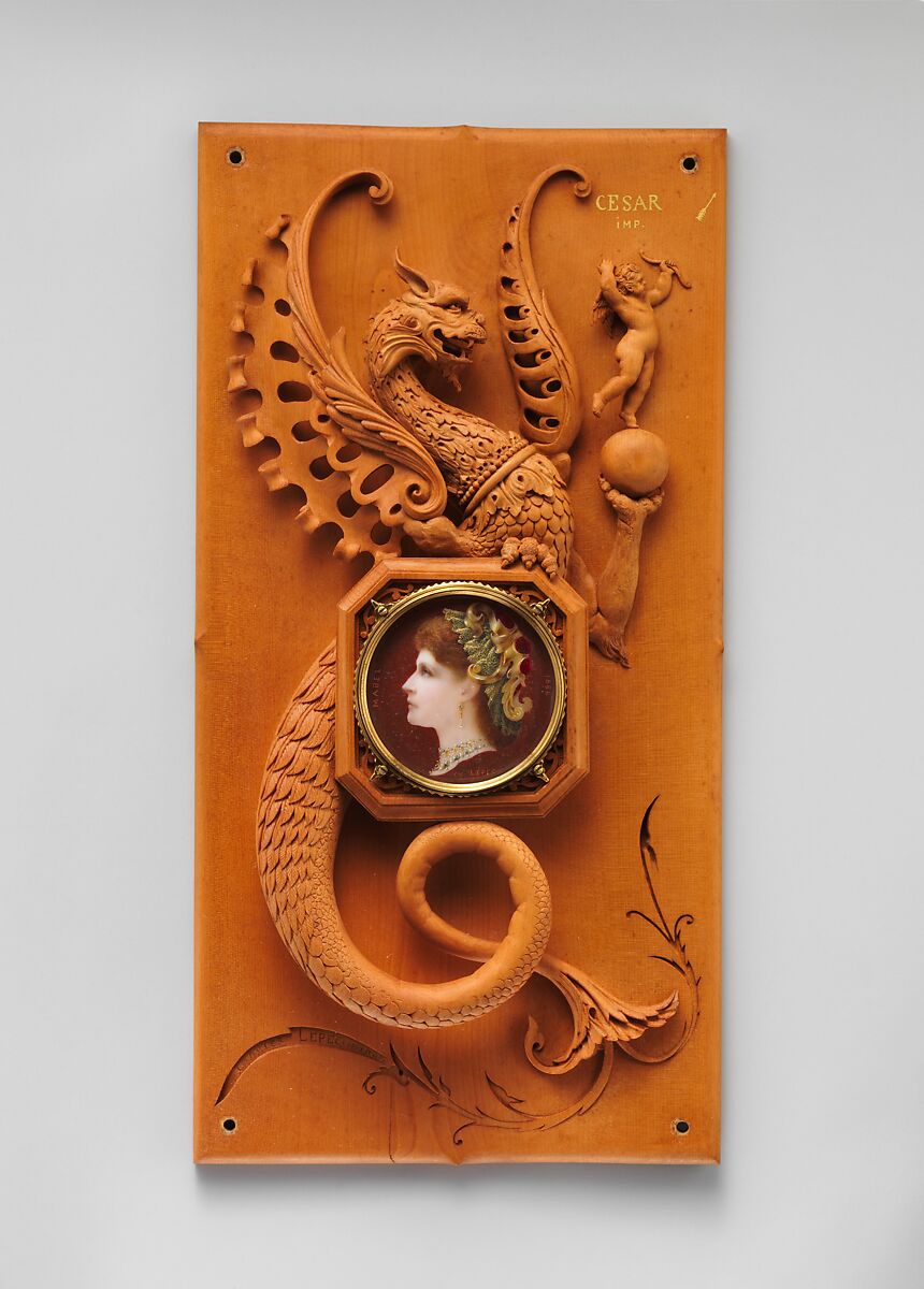 Trained as a painter, Charles Lepec is best-known today for his work in enamel. This decorative panel framing the portrait medallion of Mabel Morrison, wife of the English collector Alfred Morrison (1821–1897) and a patron of the artist, illustrates that he was a virtuoso carver as well.
