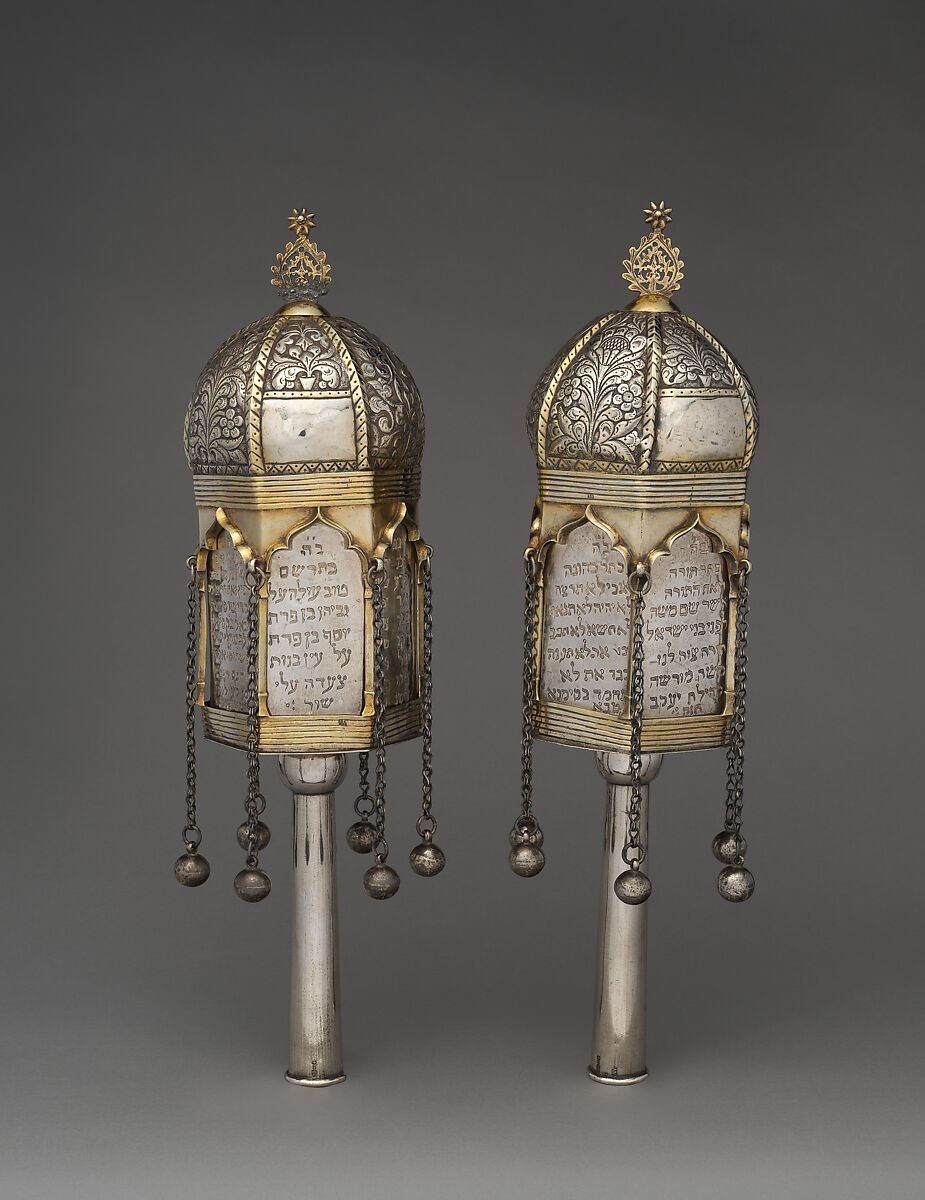 In synagogues the scroll of the Torah, the first five books of the Hebrew Bible, is often decorated with silver finials. The eclectic shape merges Ottoman architectural details, neo-gothic and traditional Judaic ornaments with extensive Hebrew citations, which refer to the Torah’s central status in Jewish life. The use of diverse motifs documents the constant cultural exchange between the Jewish congregations in various regions of Europe and Asia.