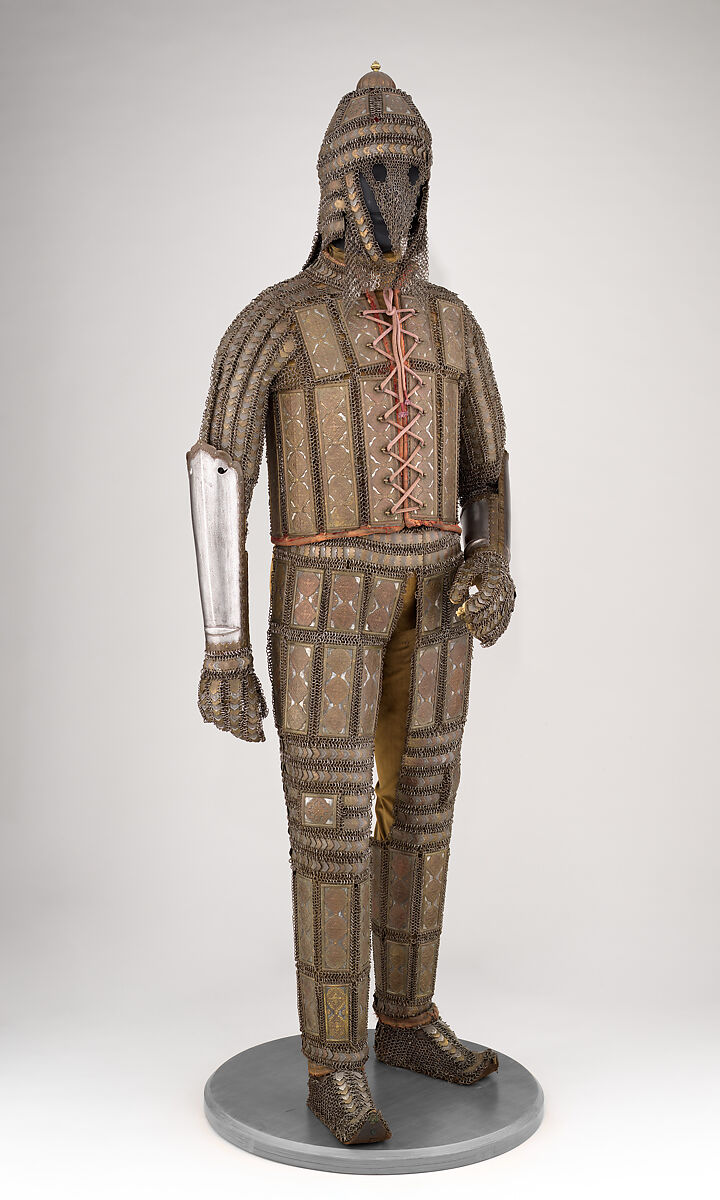 This distinctive armor, constructed of mail and steel plates decorated with embossed brass plaques, is thought to come from the northeast Indian kingdom of Sind, now a province in southern Pakistan. The region was ruled by mirs of the Talpur family from 1783 until 1843, when it was taken over by the British. Very few of these complete Sind armors survive, and this is one of the best examples.