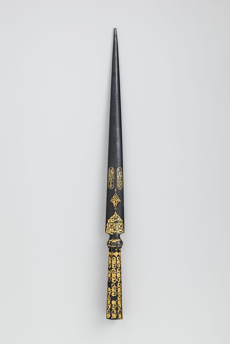 Heads of this type were used on the spears of mounted warriors. The Persian inscription in the two cartouches praises the weapon's prowess: "Constantly it drinks the water from the fountainhead of the heart."