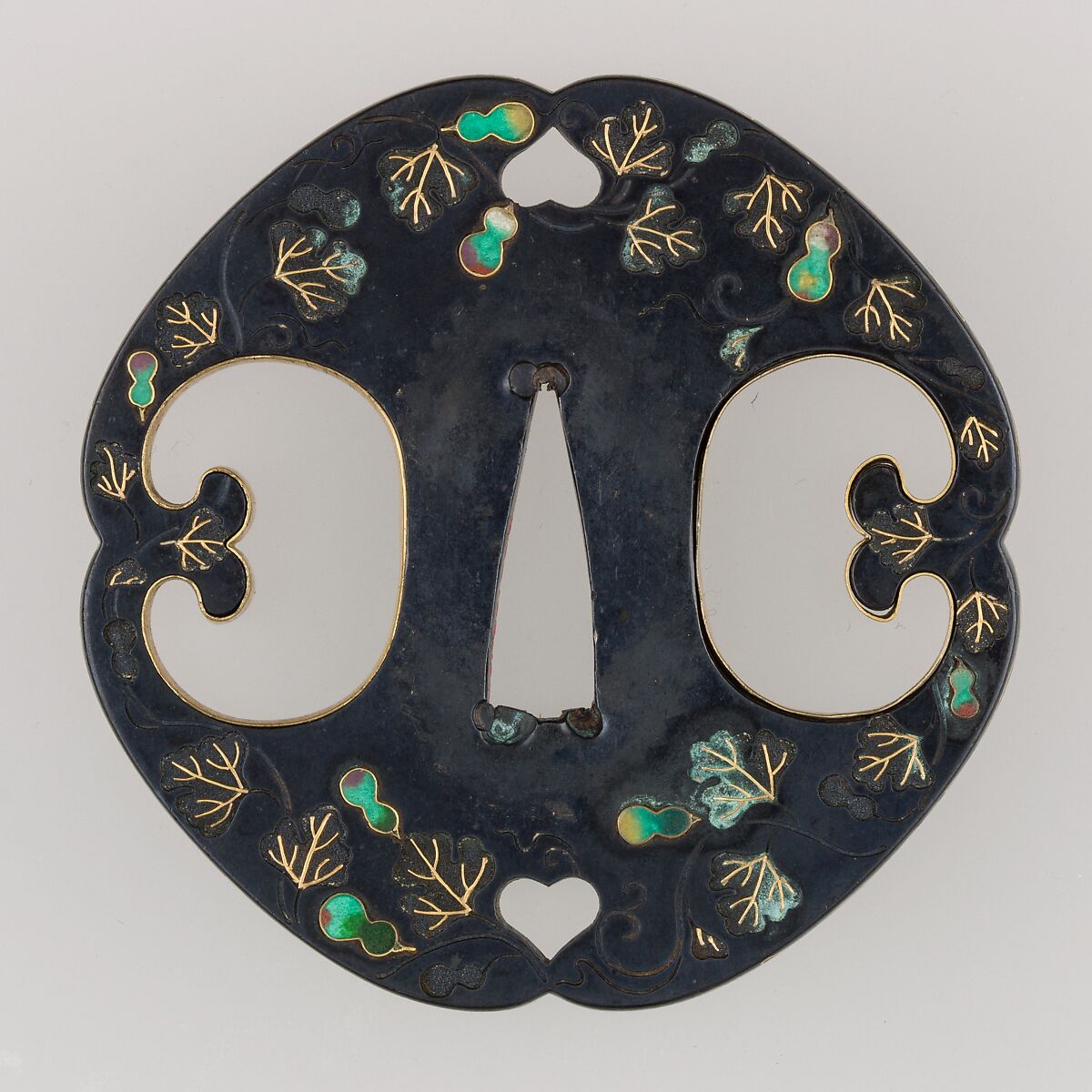 This sword guard (tsuba) features a design of gourds and leaves.