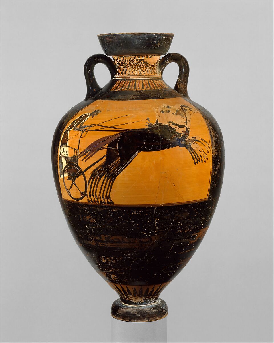 In addition to stylistic criteria, the device of a flying horse on Athena's shield suggests an attribution to the Kleophrades Painter. The motif seems particularly appropriate here because the artist conveys the speed of the chariot by the position of the horses who appear to be flying over the ground.