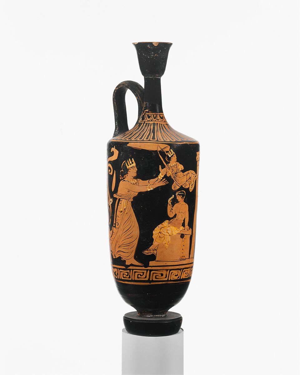 The Aiora and Anthesteria, Athenian festivals dedicated to Dionysos, god of wine, included girls swinging. The Hermaia, celebrating Hermes, the messenger god, featured athletes; the youth here holds a strigil (scraper), and Hermes himself stands by a column suggesting a sacred precinct. The Athenian festivals may have had Apulian counterparts.