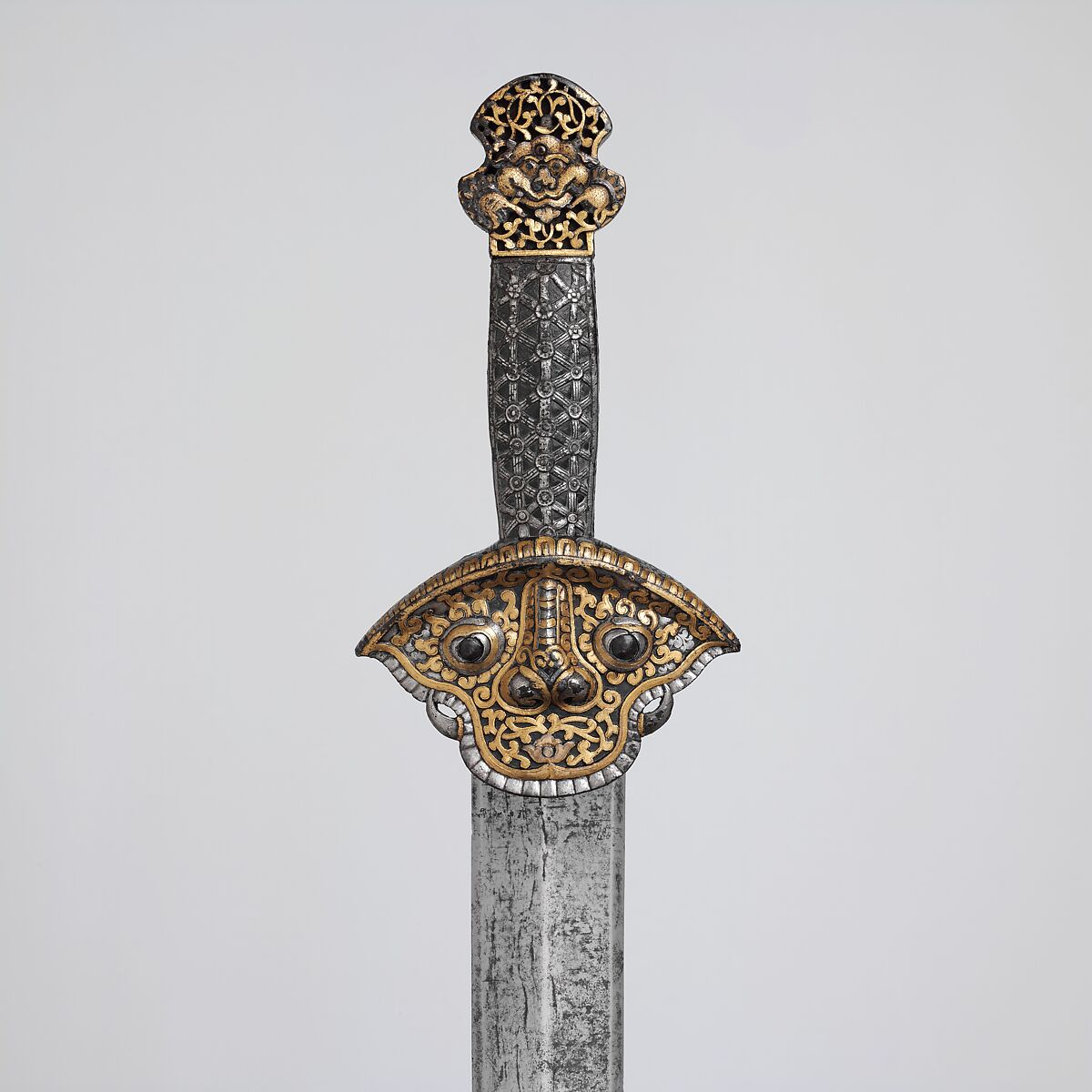 This is one of the best examples from a small group of rare early swords from Tibet. The hilt of this sword, including its grip, is made entirely of iron that has been embossed, chiseled, and then damascened in gold and silver. The guard, just below the grip, is in the form of a stylized mask with teeth and fangs, representing a protective deity or guardian figure. Straight double-edged blades of this type are seen more often on Chinese swords, but they were also used in Tibet.