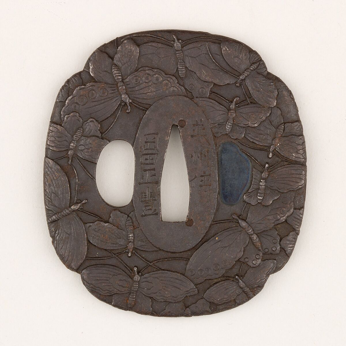 This iron tsuba shows on both sides an arrangement of butterflies which occupies entire plate.