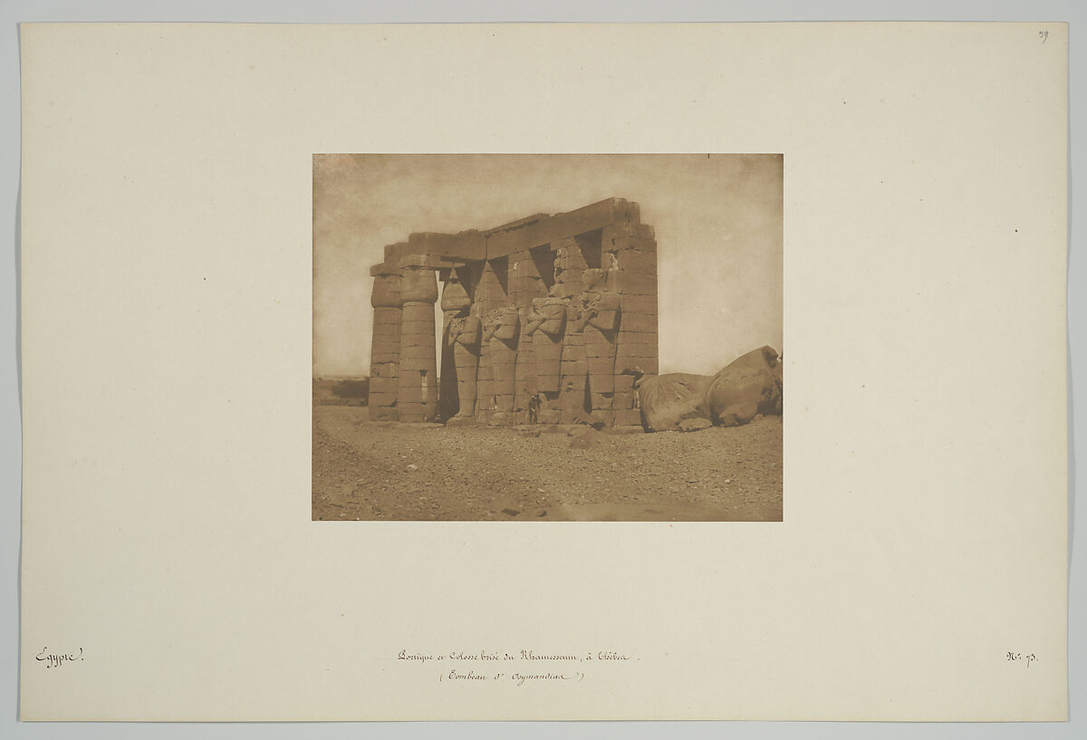 The Greeks called the ruined temple shown here the "Tomb of Ozymandias," their interpretation of Usermaetre, one of the names of Rameses II (r. 1327-1304 B.C.). Du Camp's view shows the temple's portico and a fragment of one of the two granite colossi that lie in the yard of the Second Court. The upper sections of the colossi had been removed in the earlier part of the century and sent to the British Museum. It was on the arrival of the bust of Rameses II in London that Percy Bysshe Shelley (1792-1822) wrote his famous sonnet "Ozymandias" (1818). Du Camp included this photograph in a unique, privately printed portfolio of 174 photographs that was once part of the collection of the architect Eugène Viollet-le-Duc.