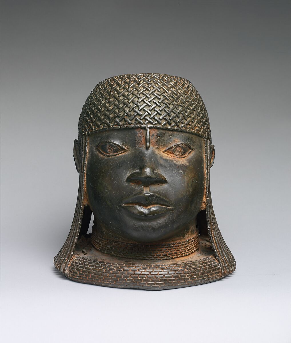 This commemorative cast-brass sculpture depicts the idealized likeness of an oba, or king, wearing a woven cap of coral beads, with lateral strands of coral suspended around both ears. A single bead extends from the headdress to the forehead, aligned with the ridge of the nose, creating bilateral symmetry. The youthful face is round and rendered with precise naturalism. A rolled collar is worn low on the neck and is characteristic of imagery associated with Benin rulers. A circular opening at the summit of the head would have accommodated a carved elephant tusk. This sculpture would have held a place of honor on an altar in the palace of the kingdom of Benin (in present-day Nigeria), during the early half of the sixteenth century.