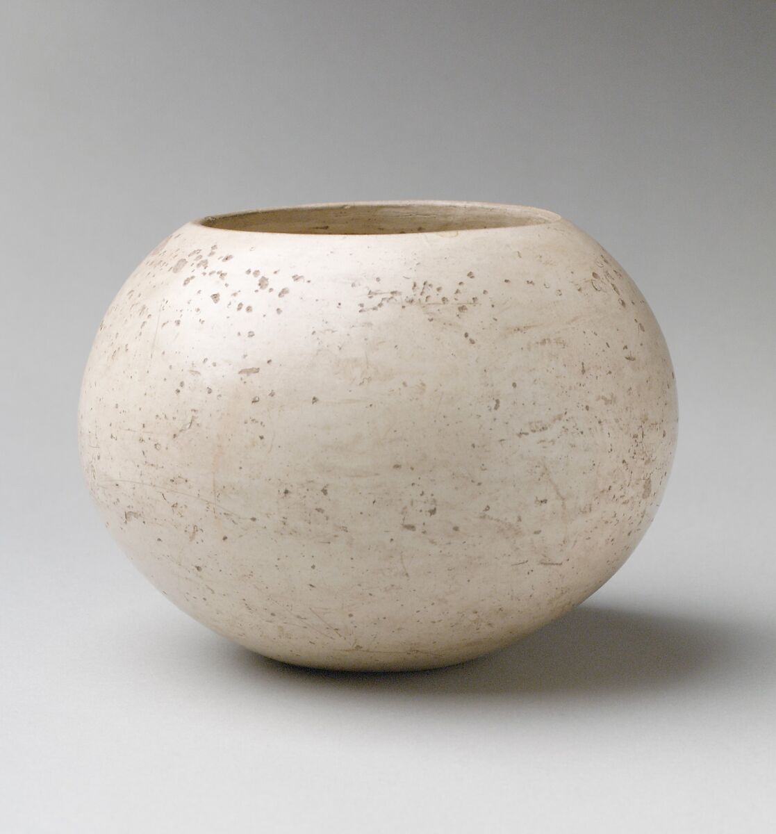 This bowl is in a full, round shape with a small opening at the top. A potter carefully built this thin-walled vessel using a coil technique with a kaolin-like clay, finishing it with a light-colored slip and burnishing the surface, which displays small pitted losses. The vessel type is known as a tecomate (“gourd”), named after the gourds that inspired their original form. Some of the earliest ceramic vessels in Mesoamerica took the form of gourds captured in the more durable material of fired clay. Tecomates were important receptacles for community feasts, and many were subsequently placed in burials as important funerary offerings. While numerous tecomates are said to be from highland sites such as Tlatilco and Las Bocas in central Mexico, the comparatively heavy, thick walls of this example suggest that it might be from one of the Gulf Coast Olmec sites such as San Lorenzo or La Venta.
