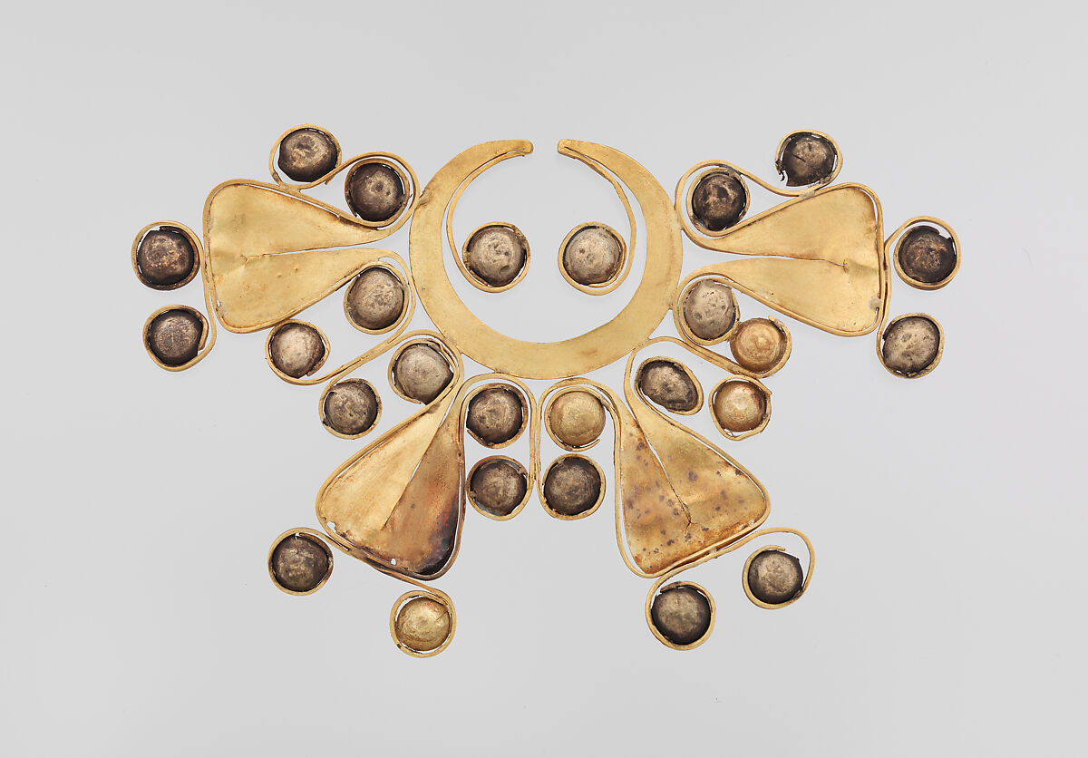 Tolita-Tumaco metallurgists deployed a wide array of techniques to transform gold—acquired as nuggets from riverbanks—and gold alloys, and sometimes silver or even platinum, into elaborate objects with intricate designs. Ornaments made of these precious metals were used to adorn bodies of the living but also the bodies of ceramic effigies. Such regalia reinforced chiefly authority and religious power. The Ecuadorian metallurgic tradition is characterized by the frequent use of fine metal wires and granulated beads, fusion gilding (joining parts by applying a thick metal coating on both surfaces) and combining different metals into alloys with different hues. Here, this delicate crescent-shaped nose ornament features four leaf-shaped forms bounded and connected with wires encircling twenty-six balls.