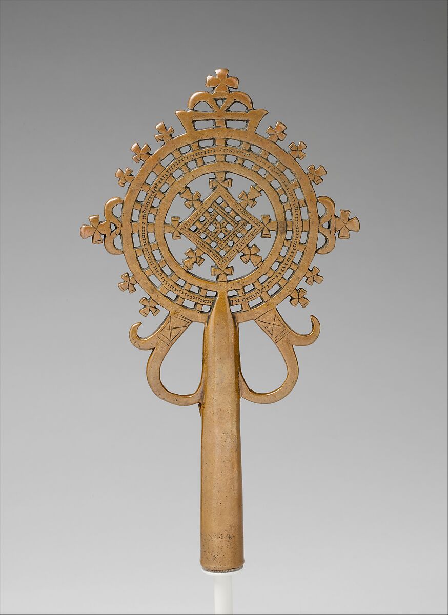 By the early Solomonic period (ca. 1270–1530 ce), Ethiopian elites demonstrated their devotion and piety by commissioning manuscripts, wall paintings, and crosses. When sanctified by Christ’s blood in sacramental rites, the cross conferred infinite power to heal and bless. Identified simultaneously with the triumph of resurrection and the Tree of Life, the cross has been translated into an infinite array of complex openwork designs carved in wood or cast in bronze or silver. The regenerative properties of the cross have been visually expressed through organic forms such as vegetation or birds radiating out from the center. While tendril-like smaller crosses convey a sense of vitality and growth, avian motifs herald the Ascension of Christ. When the cross is affixed to a wood staff and raised heavenward by the clergy in liturgical processions, its negative space would be silhouetted against a celestial backdrop.