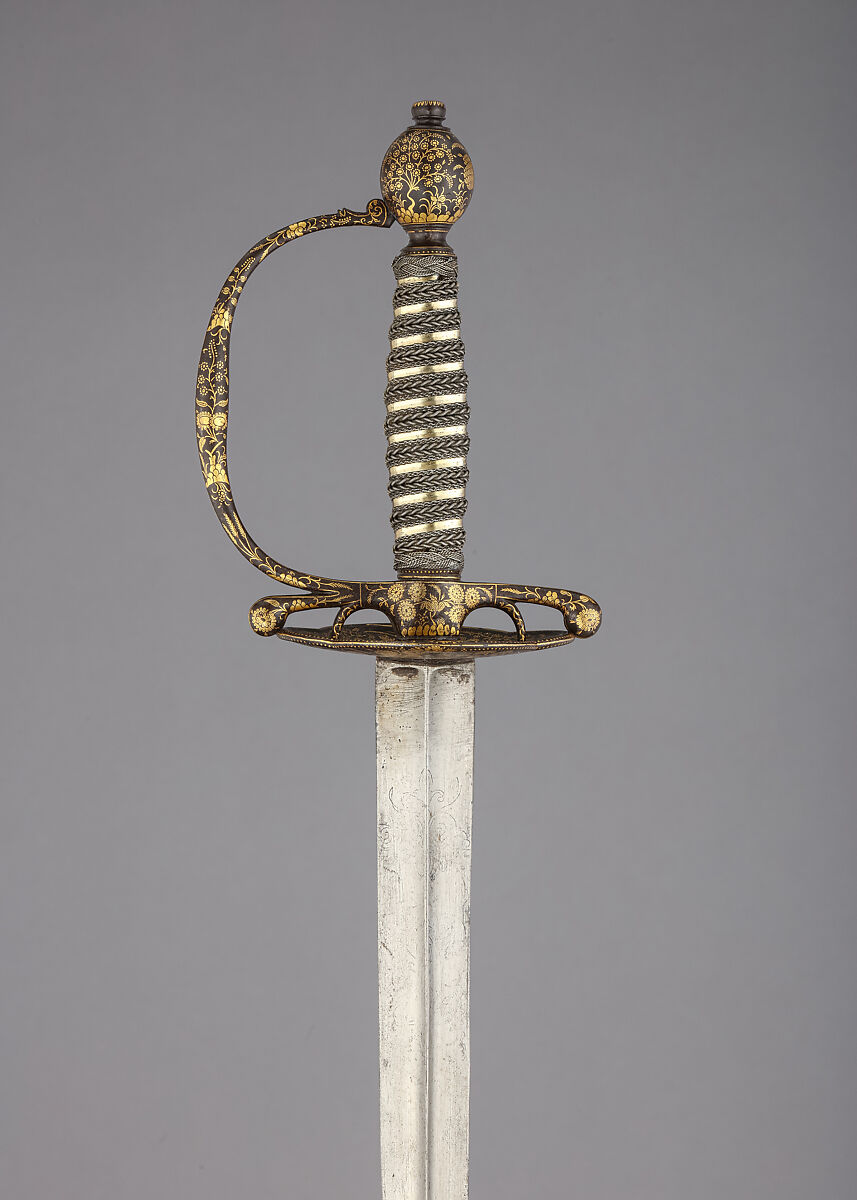 By the early seventeenth century, the rapier, a long slender thrusting sword, began to dominate as the gentleman’s weapon of choice. During the course of the century, however, as civilian fencing techniques became more specialized and refined, the rapier developed into a lighter, trimmed-down weapon known by about 1700 as the smallsword. Smallswords, often richly decorated, remained an integral part of a gentleman’s wardrobe until the wearing of swords in civilian settings went out of fashion at the end of the eighteenth century, at which time pistols were replacing swords as arms most frequently used in personal duels. The majority of smallsword hilts are made of silver or steel, but many also employ a wide variety of luxurious materials, such as gold, porcelain, and enamel. At their best, smallswords combine the crafts of swordsmith, cutler, and jeweler to create an elegant weapon that was also a wearable work of art.