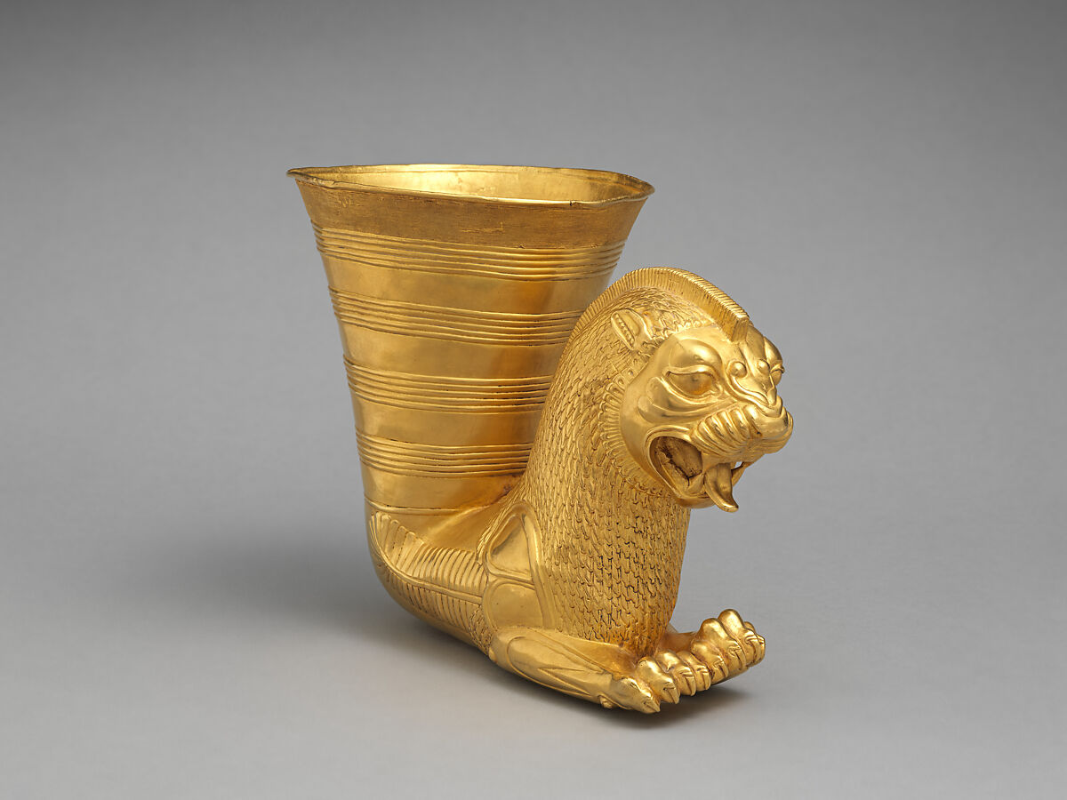 在这件阿契美尼德时期的金器杰作中,狮子的前半身向后延展时优雅地变成一只酒杯。这类器皿可能是王室和仪式所用,在用贵重金属制作酒器的漫长历史中占有一席之地。这一咆哮的狮子造型是典型的阿契美尼德风格,其凶猛的特征因使用了传统的装饰式样而得以缓和。这件器皿由不露痕迹地焊接在一起的几个部分组成,体现出高超的工艺技术。酒器的上半部分饰有总长度达一百三十六英尺的曲线,形成了共四十四个等距线圈。狮子上颚大张,其上有细小的罗纹。