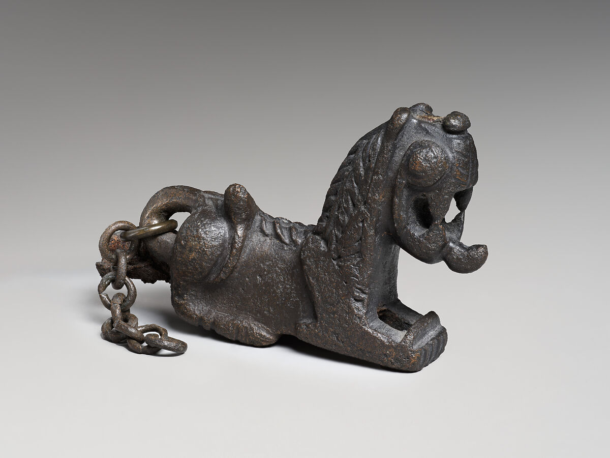 One of the most characteristic objects from Hasanlu is the so-called lion pin. Over sixty have been excavated at the site, most in Burned Building II, where they are associated—in groups of one, two, or three—with the many skeletons of individuals killed within the building at the time of its destruction. The pin, presumably used to fasten a garment, is a solid bronze reclining lion with the front paws extended and joined at the rear to an iron pin. A bronze chain attached to a loop created by a curve in the tail held the pin securely to the garment. The lion pins found at Hasanlu vary in size and weight as well as in decorative details. This example has a long mane running the length of its back. An upward curling tongue protrudes from its wide gaping mouth, and globular eyes are set on either side of its flattened head.