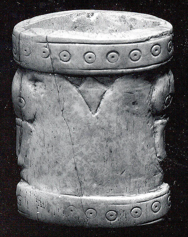 This object was found in Fort Shalmaneser, a royal building at Nimrud that was used to store booty and tribute collected by the Assyrians while on military campaign. Many thousands of pieces of carved ivory, probably used as furniture decoration or luxury objects, were excavated from storage rooms in the building. While not as common, carved shell and bone items were also stored at Fort Shalmaneser. This roughly cylindrical object was carved from a piece of bone and decorated with back to back duck’s heads in relief, with bills pointing down and held close to the breast. A circle with drilled dot at the center marks each duck’s eye, and the motif is repeated as a border of circles and dots at the top and bottom. A hole runs through the piece lengthwise, perhaps for inserting a tang that belonged to the implement for which this served as part of a decorated handle.