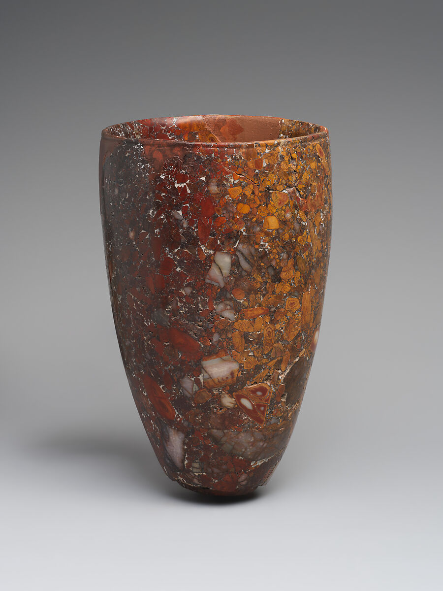 This conical stone vessel tapers towards a rounded base. Stone vessels were very common in all areas of the ancient world, and stones of striking color and appearance were often traded over great distances. It is one of the thousands of artifacts of terracotta, bronze, iron, gold, silver, and ivory which were recovered from monumental buildings at the site of Hasanlu in northwestern Iran. Hasanlu is best known for its early first-millennium B.C. occupation. At that time, it was a major local center of commerce and artistic production with close ties to other political and creative centers of the Near East. In 1957, the University Museum of the University of Pennsylvania initiated large-scale excavations at the site with the Iranian Archaeological Service. The Metropolitan Museum of Art co-sponsored the excavations from 1959 to 1977 and received a share of the finds. Many of these objects are now on display in the Museum. Hasanlu was settled from the sixth millennium B.C. through the Achaemenid Persian period of the fifth and fourth centuries B.C., as well as later in the thirteenth and fourteenth centuries. Excavations included both stratigraphic soundings and horizontal clearance of the early first-millennium B.C. levels, when the settlement included a fortified citadel and a surrounding lower town and cemeteries. A violent attack and subsequent fire destroyed Hasanlu at the end of the ninth century B.C. and the resulting collapse of buildings buried not only numerous artifacts but also many of the inhabitants.