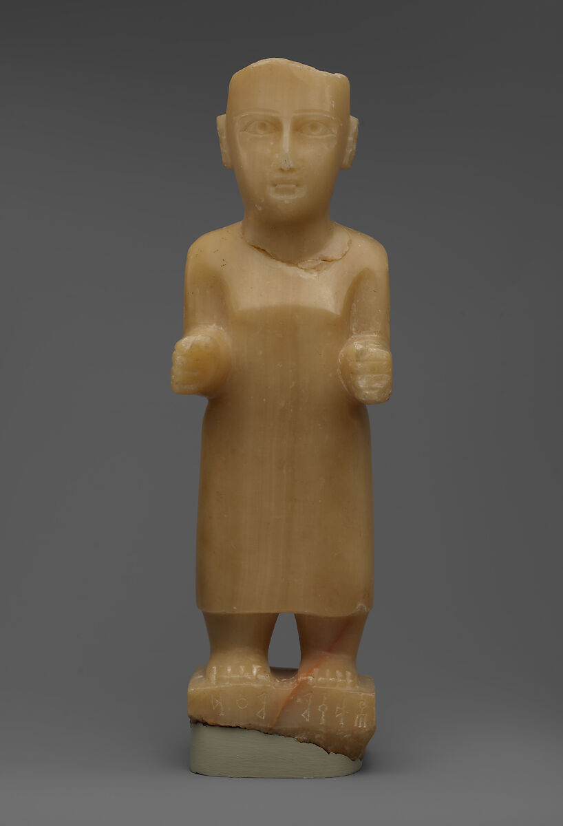 This standing male figure is a funerary or votive object intended to be placed in a tomb or temple. Dressed in a long, plain garment reaching almost to the ankles, the figure stands in a fully frontal pose. The base, which is carved in one piece with the figure, bears the name of the individual and his clan—Sadiqim Ma'ad. The eyes and eyebrows are carved to hold inlays, now missing, and the arms are bent at the elbows, extending out at right angles to the body. One hand is clenched in a fist, pierced vertically to hold some object, perhaps a scepter, now lost. The other hand is open. The undersurface of the base and the top and back of the figure's head are roughly carved. Such statues were often set in niches, and the surfaces not visible were consequently left unfinished on many examples. The placement of the ears high on the head, the aquiline nose, the small mouth, and the fully frontal pose are all characteristic of human images made in this region.