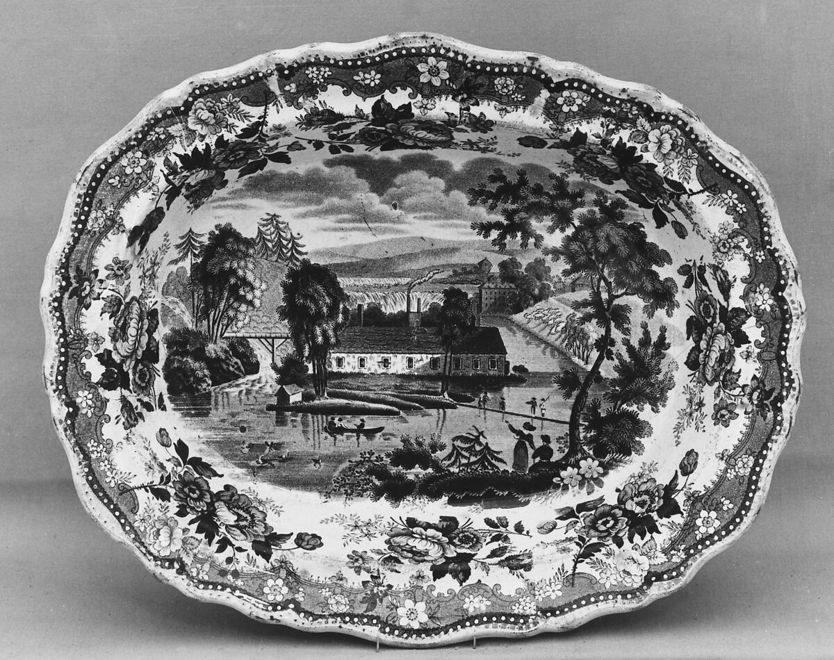 This brown and white transfer-printed earthenware dish made by the Staffordshire firm of Job & John Jackson features a view of the Iron Works in Saugerties, New York on the Hudson River. Entrepreneur Henry Barclay (n.d.) acquired the property for his firm, Barclay's Iron Works, in 1825. However, he soon exhausted his funds in the course of building two plants for the manufacture of iron and paper. Another group of investors took over the facility in 1827, renaming it the Ulster Iron Company. It remained in business for over fifty years. Jackson's view of the one-storey iron works, paper mill and observation tower situated on the banks of the Hudson was based on a drawing by Irish artist William Guy Wall (1792–after 1863) reproduced as an engraving by Fenner, Sears & Co. in John Howard Hinton's "The History and Topography of the United States of North America" (London, 1830 and 1832). Jackson included the view in its "American Scenery" series consisting of approximately thirty-two American views manufactured for the United States export market with a border of floral bouquets and blossoms, C-scrolls and an outer beaded band. The American Wing's collection contains additional pieces by Jackson from the same series, as well as original works by Wall. Refer to the Dictionary for a definition of the term "transfer-printing" and for information about Jackson.