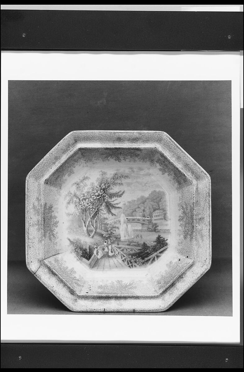 This blue and white transfer-printed earthenware dish made by the Staffordshire firm of William Ridgway, Son & Co. features a view of Fairmount Gardens and the Schuylkill Bridge at the Fairmount Water Works in Philadelphia, Pennsylvania. It belongs to a series of approximately twenty-six American views with moss-decorated borders titled "Catskill Moss" registered on December 16, 1844. The letters “C.C." printed on the back of the dish signify "common crockery" and were registered as a trademark when the firm operated at the Cobden Works from about 1841 to 1846. Built in the Neoclassical style from 1812 to 1824 after designs by Philadelphia engineer Frederick Graff (1774–1847), the Fairmount Water Works were among the first hydraulic-powered systems in the United States. The facility included a dam that backed up the Schuylkill River for nearly six miles to create the power necessary to pump millions of gallons of water into the reservoir situated at the top of "Faire Mount." Providing a scenic setting for the Water Works, Fairmount Gardens, also known as Fairmount Park, was among the nation's first parks. The Gardens and Water Works quickly became popular tourist attractions admired for their architectural and scenic beauty and innovative technology. Views of the site by other potters appear on a plate, 16.83.7, by Henshall, Williamson & Co (ca. 1802–1828), a plate, 10.57.15, by Joseph Stubbs (ca. 1822–1836) and a plate, 14.102.290, by Enoch Wood & Sons (1818–1846). Ridgway's view of the Gardens was based on a drawing by English artist William Henry Bartlett (1809–1854) engraved by English engraver James Giles (active 1840) and reproduced as “Fairmount Gardens, with the Schuylkill Bridge, Philadelphia" in Nathaniel Parker Willis' "American Scenery" (London, 1840). Bartlett was among the finest topographical draftsmen of the nineteenth century. Over one hundred of his drawings were published in "American Scenery," which established the route for the so-called "American Grand Tour" and became one of the most influential travel books of the period. The Museum's collection contains additional pieces by Ridgway, as well as original works by Bartlett and various editions of “American Scenery." Bartlett's American views also inspired decoration on export wares by other firms, including scenes on several pieces, 14.102.65, 14.102.265 and 14.102.327, from the "American Scenery” series by an affiliated firm, William Ridgway & Co. (ca. 1834–1854). Refer to the Dictionary for a definition of the term "transfer printing" and for information about the above-mentioned firms.