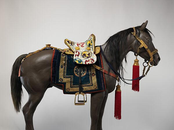 - Dimensions: Saddle: 18 1/2 x 24 x 17 in. (47 x 61 x 43.2 cm); stirrups: H., 7 in. (17.8 cm); bridle and bit: 21 x 9 in. (53.3 x 22.9 cm); Crupper: 39 x 20 in. (99.1 x 50.8 cm); tassel sockets: H. 4 3/4 in. (12.1 cm); breast collar: 72 1/2 x 1 1/2 in. (184.2 x 3.8 cm)