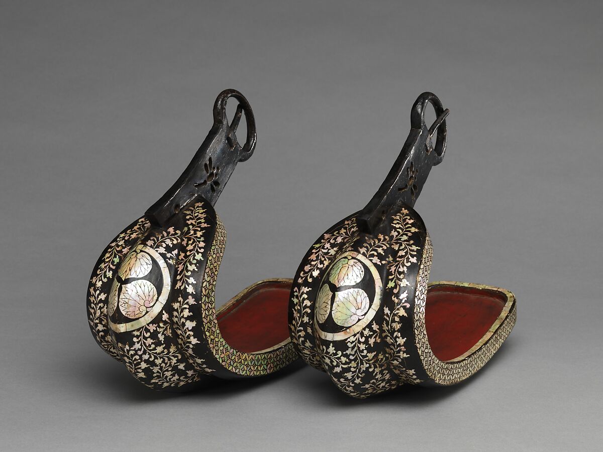 Stirrups decorated with mother-of-pearl are rare, and this pair is perhaps the finest surviving example. Prominently placed on the front of each stirrup is a mon (heraldic emblem) consisting of three hollyhock leaves in a circle signifying the ownership of the Tokugawa family, which held the office of shogun (supreme military commander of Japan) from 1603 to 1868. At the time these stirrups were made, luxurious objects displaying the Tokugawa mon so prominently would have been appropriate only for Tokugawa Ieyasu, his son Tokugawa Hidetada (the first and second shoguns, respectively), or one of their closest relatives.