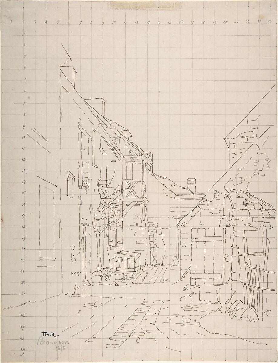 This work is highly unusual in the landscape painter’s graphic oeuvre; there is only one other known drawing by the artist squared for transfer. Rousseau made drawings to record the topography of sites he visited, but they rarely correspond directly with finished paintings. The inscription "Bourron" likely refers to Bourron-Marlotte, a village south of the Fontainebleau forest, a site popular with other early Barbizon painters including Camille Corot (1796–1875) and Caruelle d’Aligny (1798–1871). The sparse linearity with which Rousseau describes the stone surfaces of this cobbled alleyway represents a graphic approach favored by the artist in the later decades of his career.