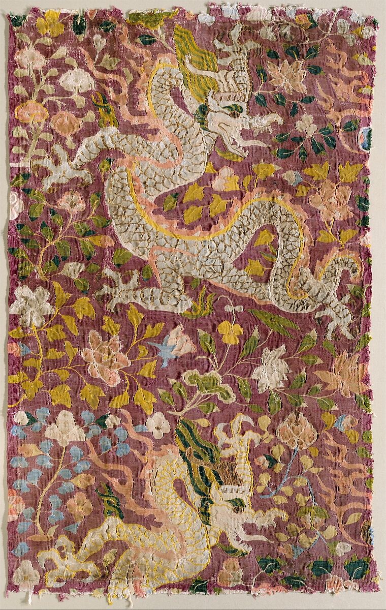 这件丝织挂毯上的装饰属典型的中亚风格,中亚作品里的图案设计历史悠久、变化无穷。这条龙的长鼻和压在后腿之下的龙尾表现出一种唐代的艺术手法,这种手法后来在中亚保存下来,起码继续流传到了蒙古征服者忽必烈于1271年创建的元朝。在花朵图案中饰有龙纹,这很可能是中亚地区创造的一种艺术手法。明亮的色彩和龙的活力也都是这一地区所产挂毯的特色,其制作者可能是维吾尔人,他们因出色的织锦服饰而闻名。