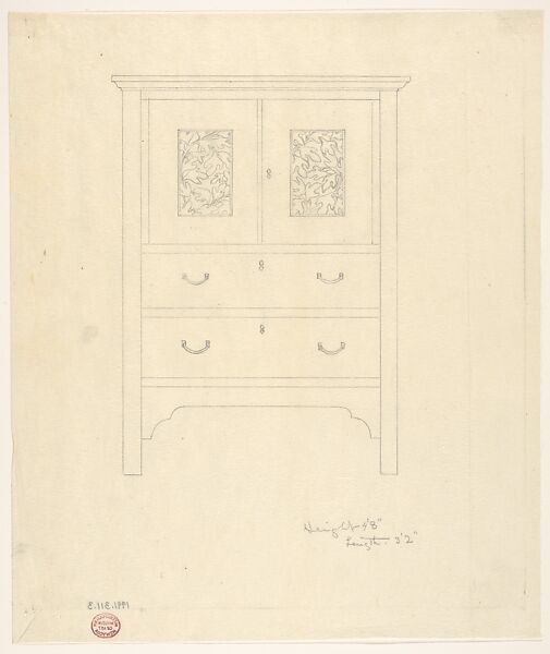Inspired by the ideas of the Arts and Crafts Movement, the Englishman Ralph Whitehead, who had studied under John Ruskin at Oxford, sought to establish his own ideal, self-sustaining art community in the United States. After a failed experiment in Oregon, in 1902 he founded the Byrdcliffe Arts and Crafts Colony right outside Woodstock, New York. In 1903 he published his vision for the community: ‘[It] is our intention to make furniture of a simple kind which shall be good in proportion, and to which distinction may be given by the application of color and carving by artists' hands (…)’. This oak linen press perfectly embodies these ideas in its modest, rectilinear shape, hand-carved panels and wood surfaces finished with transparent stains in natural colors. The piece also illustrates Whitehead’s idea of artists working together and combining skills to create beautiful and honest furniture pieces. While he himself designed the outline of the linen press, the carved panels with stylized sassafras leaves were designed by Edna M. Walker, who graduated from Brooklyn's Pratt School of Design before joining Whitehead in 1903.