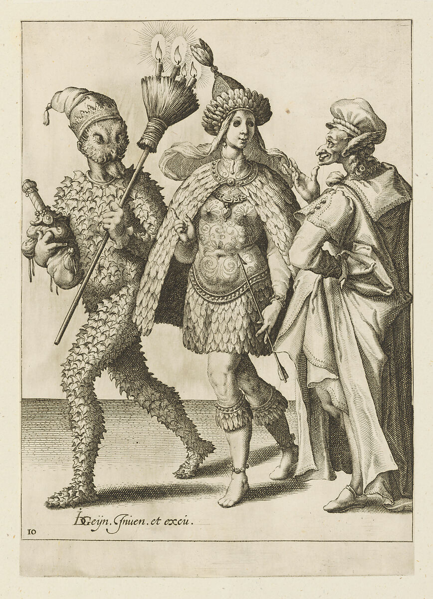 Composition of three figures. On the left side two figures are depicted wearing costumes. On the far left, a male figure wears a suit made out of ivy and an owl mask. The second figure wears a cuirass with a skirt and cape made out of feathers. The costume resembles the dress often associated with the 'savage cultures' from the Americas. On the right side of the print an elderly figure with donkey ears is depicted who seems to be addressing the other two.