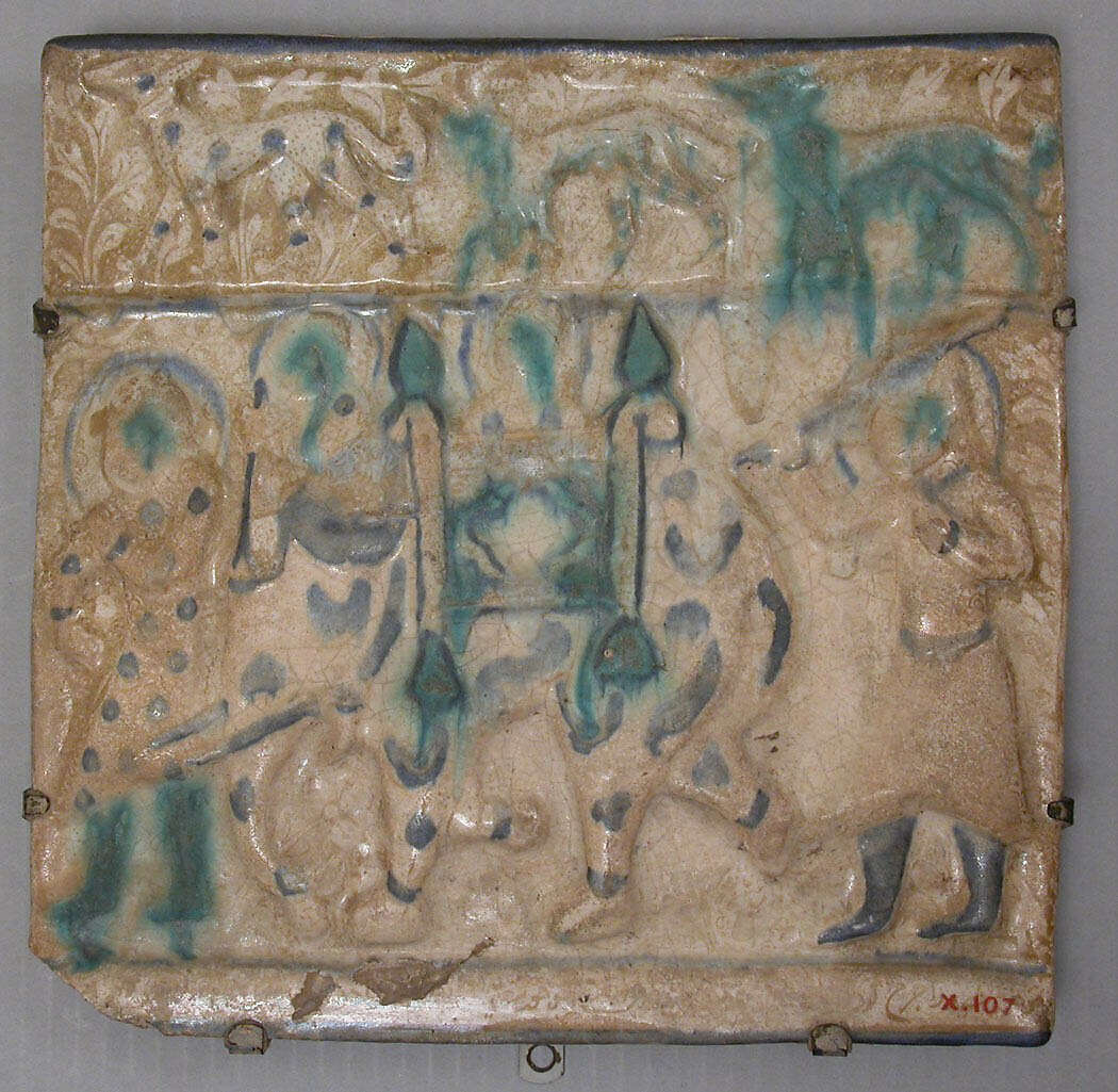 This stonepaste tile likely from the Ilkhanid summer palace of Takht-i Sulaiman contains a scene from the Shahnama. Possibly depicting the story of Bahram Gur returning to India with his bride, its main field bears a rider seated in a howda (carriage) on an elephant’s back, escorted by two haloed figures. The inscription along the bottom is illegible.