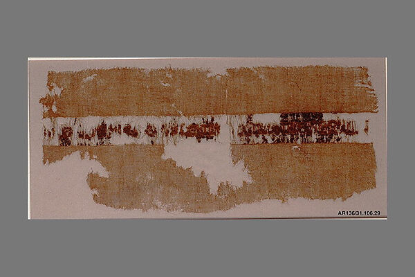 Flax, from which linen fibers were made, was the main cash crop of Egypt during the Fatimid period, and the trade of linen helped sustain the economy. The court gave sumptuous fabrics like this one as ambassadorial gifts, with the caliphal treasuries known for housing fabrics of remarkable splendor. Surviving Fatimid textiles are often inscribed or adorned with ornamental bands featuring rows of animals and other motifs. On this fragment, the central theme consists of a series of birds flanking reciprocal half-palmettes, all of which are linked by a scrolling vine woven in silk. Mirroring this rhythmic alternation are registers filled with cartouches, each containing an abstracted arabesque. The monotonous repetition is broken by the color of their respective backgrounds, which flows from pastel blue to yellow and green.