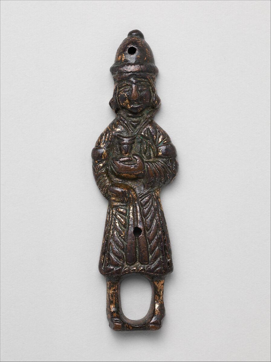 This small brass figure, whose original use is unknown, represents a standing figure holding a cup. In the pre-Islamic Central Asian Turkic nomadic world, ceremonies involving the drinking of wine from cups were associated with kingship and investiture, and implied the establishment and display of social hierarchies. Among the many representations of this period, are stone statues depicting a standing or squatting cup-bearer which were found in funerary contexts.