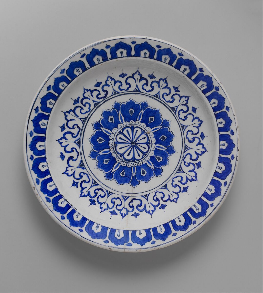 This dynamically decorated sixteenth-century dish in cobalt blue was produced at the famous kilns at Iznik, in western Anatolia. Stylized variations of lotus petals, ultimately of Chinese inspiration but geometrically patterned into a radiating sunburst of powerful Islamic design, bear witness to one of the most fruitful cultural exchanges in history: the mutual influences flourishing for centuries between the artists, especially potters, of eastern and western Asia. Chinese influences on Islamic art peaked in the thirteenth and fourteenth centuries, when nearly all Asia came under the sway of the Great Khans, the Mongol overlords ruling from Beijing. The Ilkhanids who governed the Near East from their capital at Tabriz, in modern northwestern Iran, imported precious Chinese wares, commanding local Muslim artists to study Chinese technique and design. The sixteenth-century potters of the Ottoman court though set at the westernmost limit of the Asian world, still pursued–and creatively renewed with great flair and pride–the traditions of the Tabriz school.