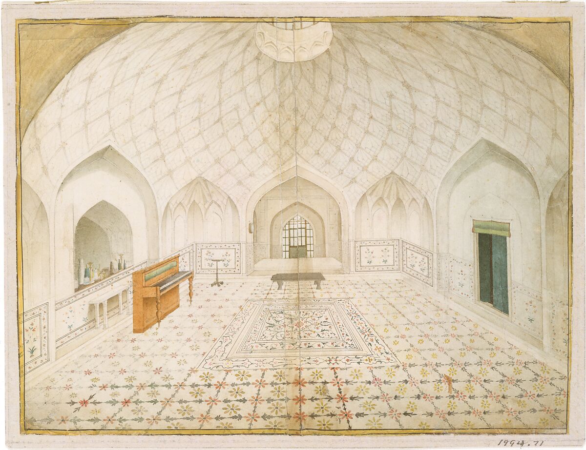 It was not unusual for the resident British of nineteenth-century Delhi to buy ruined or abandoned Mughal or Sultanate buildings and monuments, which they then converted from their original functions to habitable spaces. This painting illustrates the conversion of a hammam (bath house) into a living room, complete with a piano or harpsichord, a bench, and an assortment of glass bottles and other objects. The white floor inlaid with flower motifs resembles that of the hammam at the Red Fort in Delhi, where a British national had been installed by the early nineteenth century.
