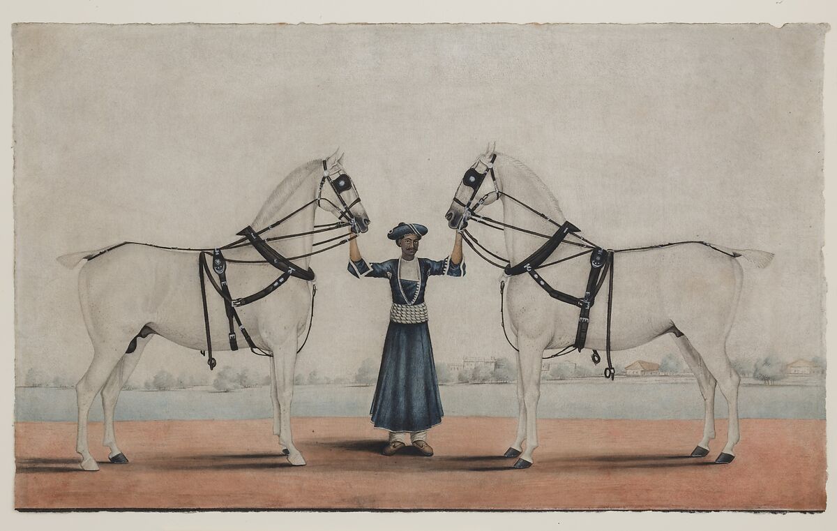 Many of the East India Company officers who commissioned paintings during the nineteenth century sought a visual record of their own households, including animals, possessions, and servants. Shaikh Muhammad Amir of Karraya specialized in such paintings and depicted these subjects with a naturalism that is both dignified and poetic. In this work the artist has painted a syce, or groom, symmetrically flanked by almost identical horses.