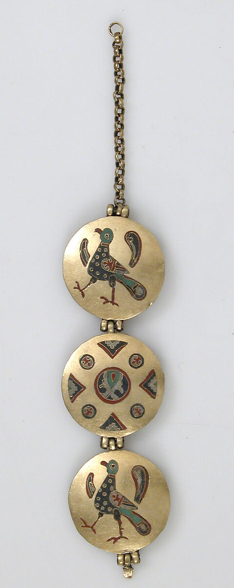 Chains, called riazni, were created from small cloisonné enamel medallions. The chains may have joined layers of dress, been worn as necklaces or bracelets, or used to suspend circular or crescent-shaped pendants known as temple pendants or kolti. Rus' women wore temple pendants in pairs, suspended beside the face, at the temple, as part of their elaborate headdress.