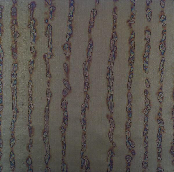 Sudo is inspired by how stainless steel pots and pans burn to a beautiful opalescence over a burner flame. This loosely woven stainless steel broadcloth is held over an open flame, the gas jets marking stripes across the surface to create the pattern.
