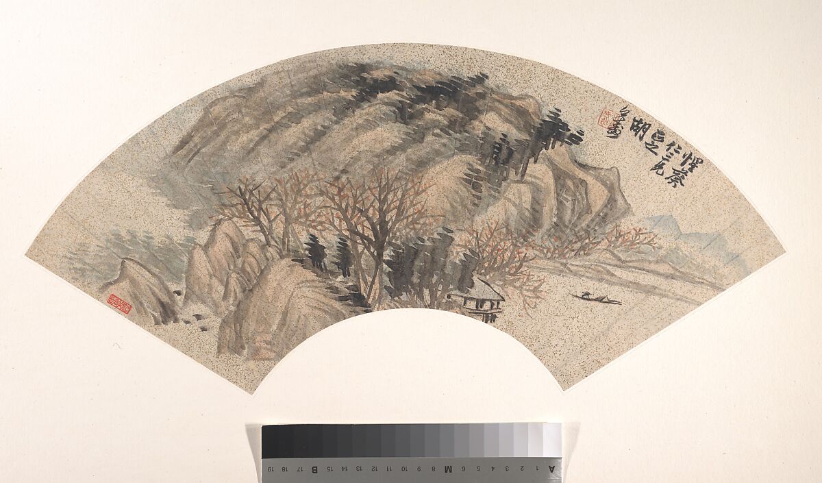 Traditional methods of landscape painting are invoked by Hu in this fan. Mountain forms are built using a system of brush dabs, while forests are created by an assembly of ideogram trees. Dilute ink and pale colors soften the rigor of the traditional conception, producing work with an easy popular appeal.