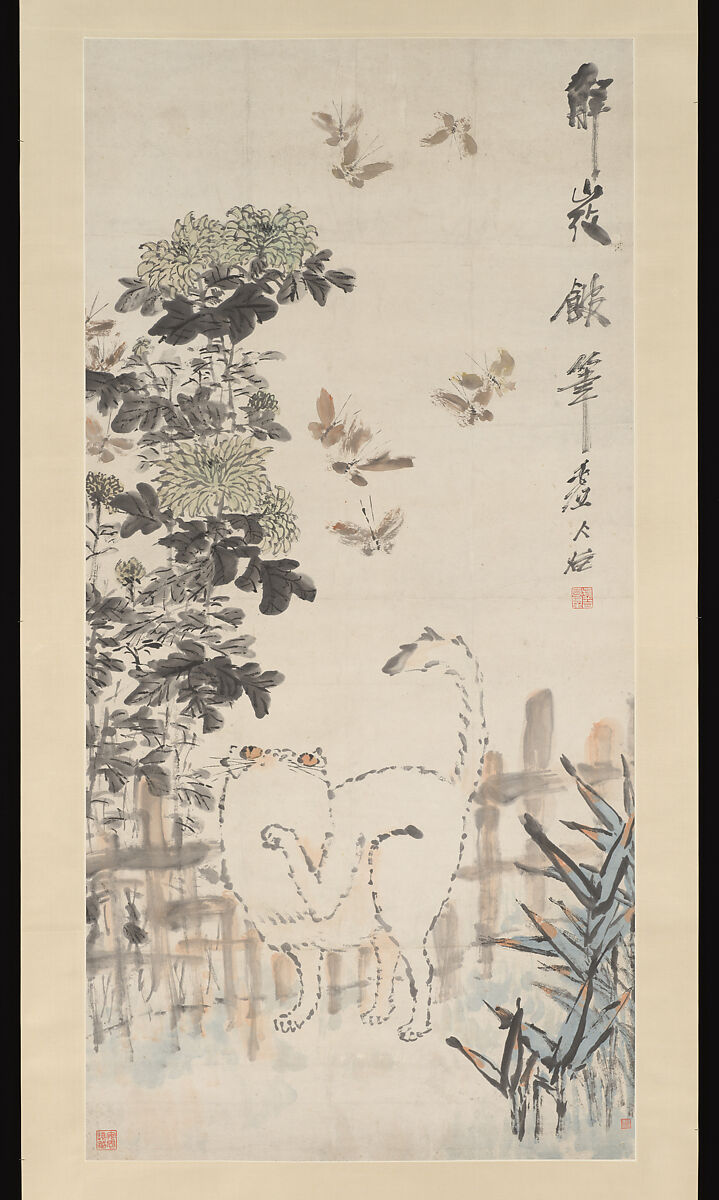 Xu Gu has invoked the 18th century Yangzhou Eccentric Hua Yen's (1682–1765) humorous animal subjects, though he has not attempted Hua's technical virtuosity. Active viewing is required to fuse the dotted outline suggesting the cat's fur and the impressionistic strokes of his landscape also seen in this exhibition
