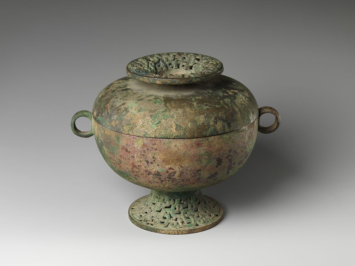 A dou is a circular bowl with a flared foot and a similar shallow bowl as a lid. This one has woven-design openwork on the foot and lid handle. Dou were used to serve grains and non-meat foods. This is indicated in its name, dou, a character that means stemmed bowl as well as bean or pod-bearing plant.